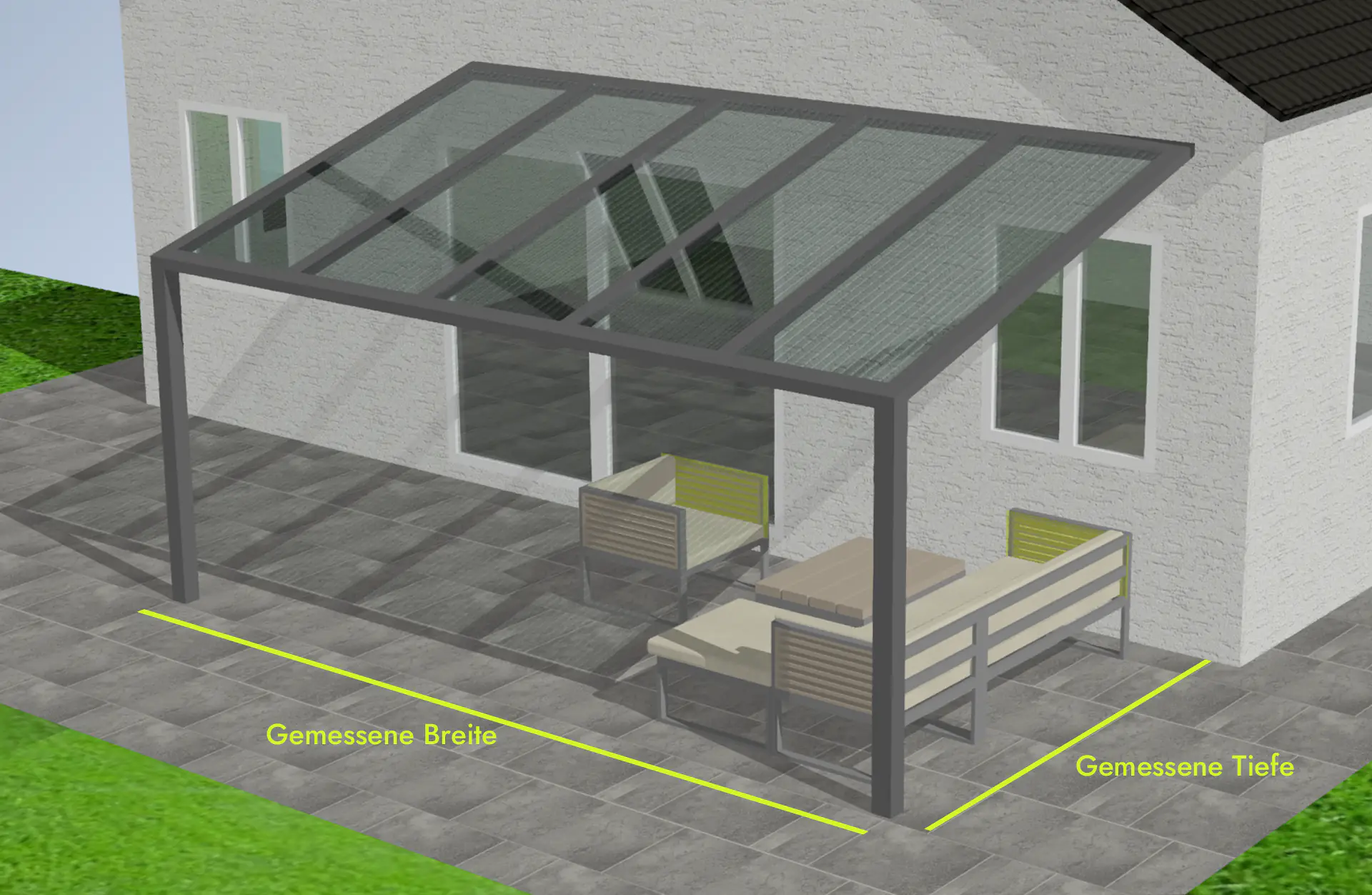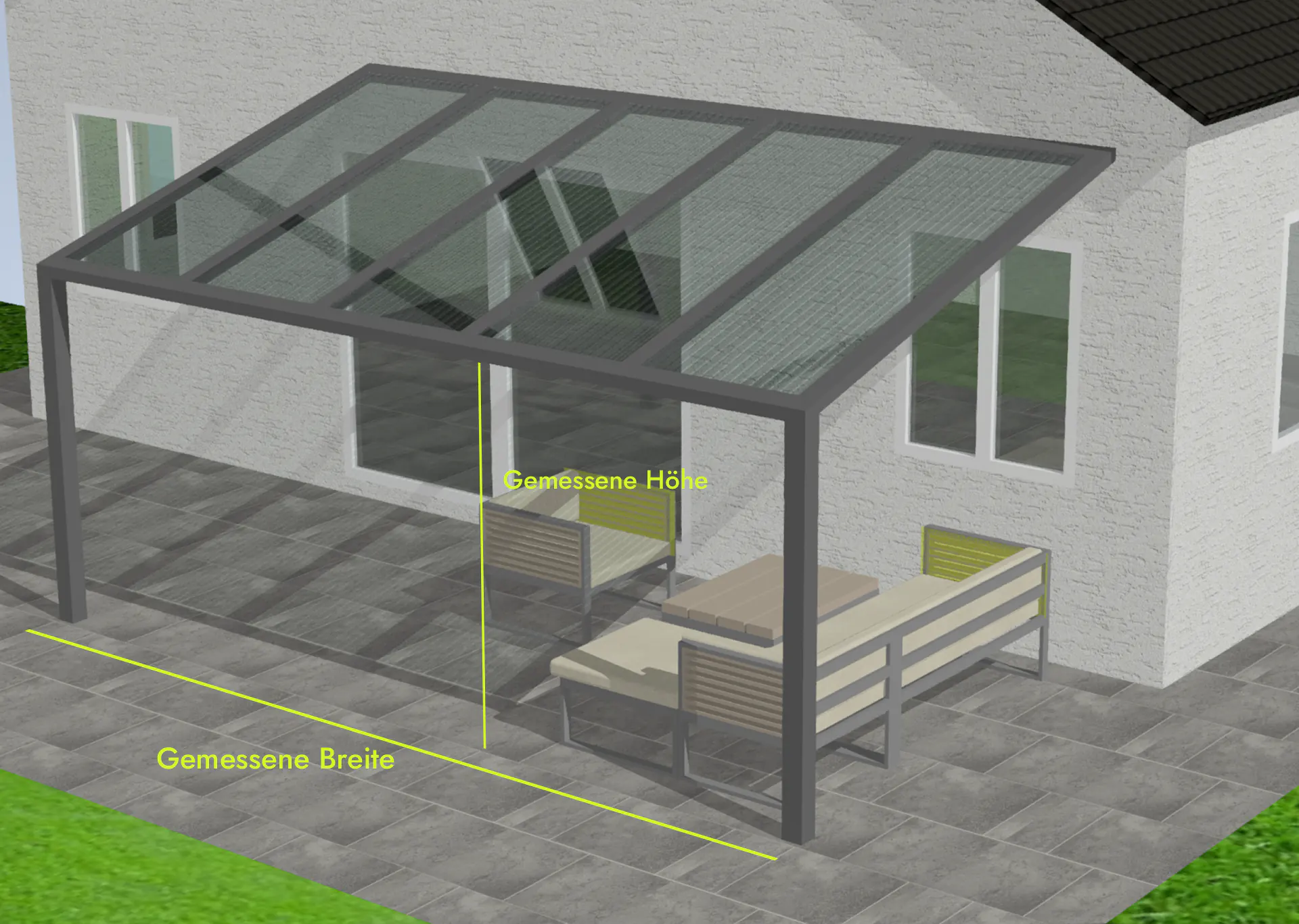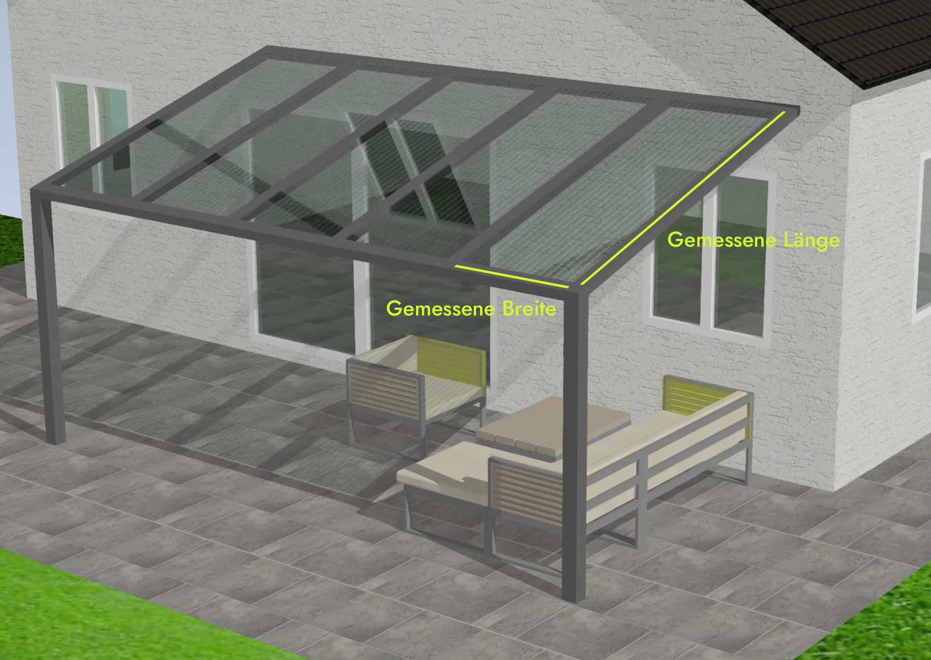 Für die Planung benötigen Sie nur die gewünschte Breite entlang der Hauswand und die Tiefe in Richtung Garten. Alle Modelle bieten eine variable Neigungsmöglichkeit von 3 bis 18 Grad. Die hier angezeigten Preise sind bereits inklusive der Versandkosten und der Mehrwertsteuer.